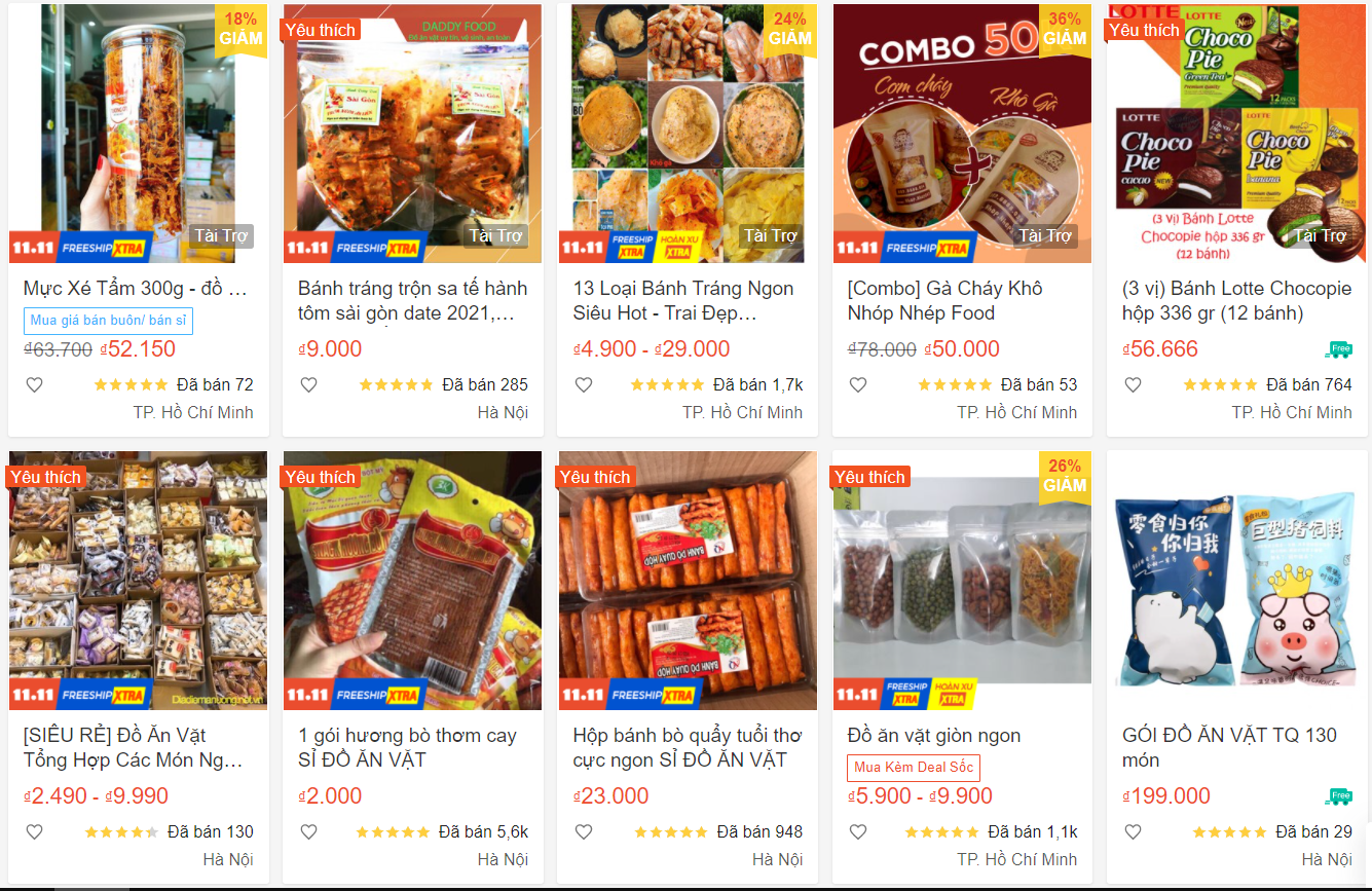 Đồ ăn vặt trên Shopee đa dạng và có số lượng bán rất nhiều