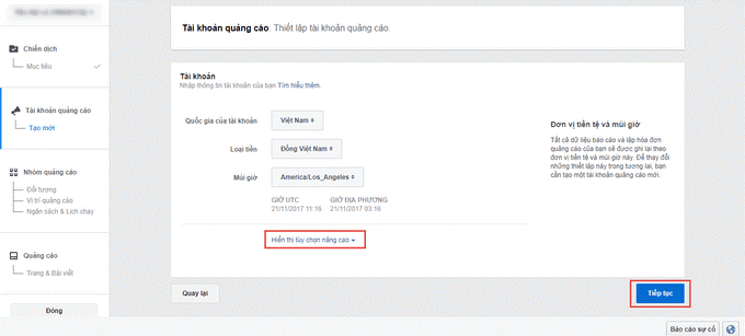 Nếu đây là lần đầu tiên bạn chạy quảng cáo Facebook thì cần phải thiết lập tài khoản quảng cáo với các thông tin như: quốc gia, loại tiền, múi giờ... Ngoài ra, bạn có thể thay đổi tên tài khoản quảng cáo bằng cách nhấn vào nút Hiển thị cài đặt nâng cao. Sau khi hoàn thành việc thiết lập tài khoản, bạn click Tiếp tục.